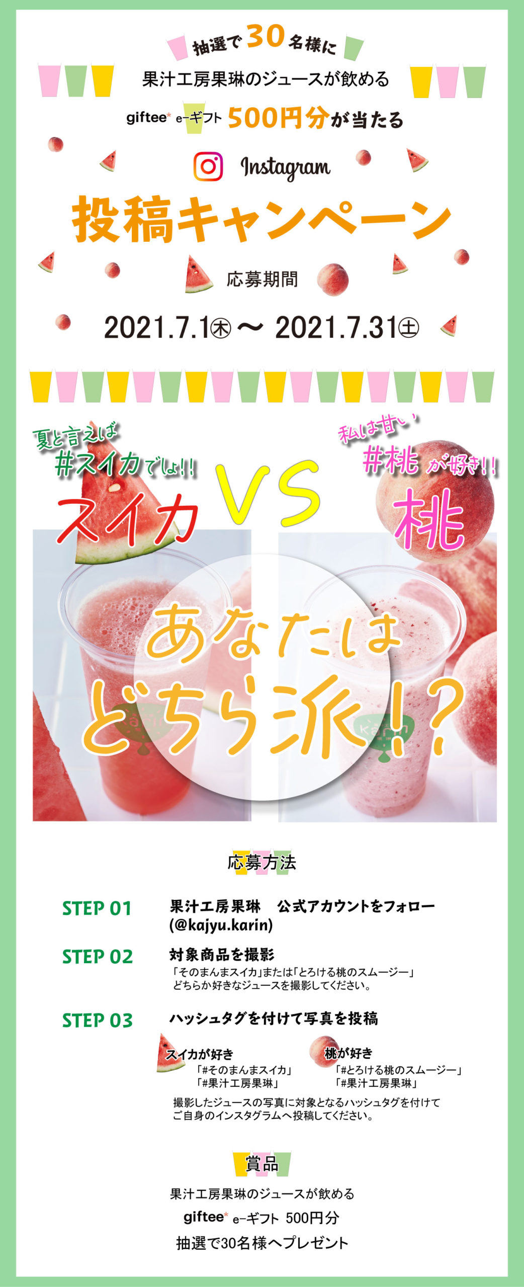 ・果汁工房果琳公式アカウントを必ずフォローしていただきますようお願いいたします。