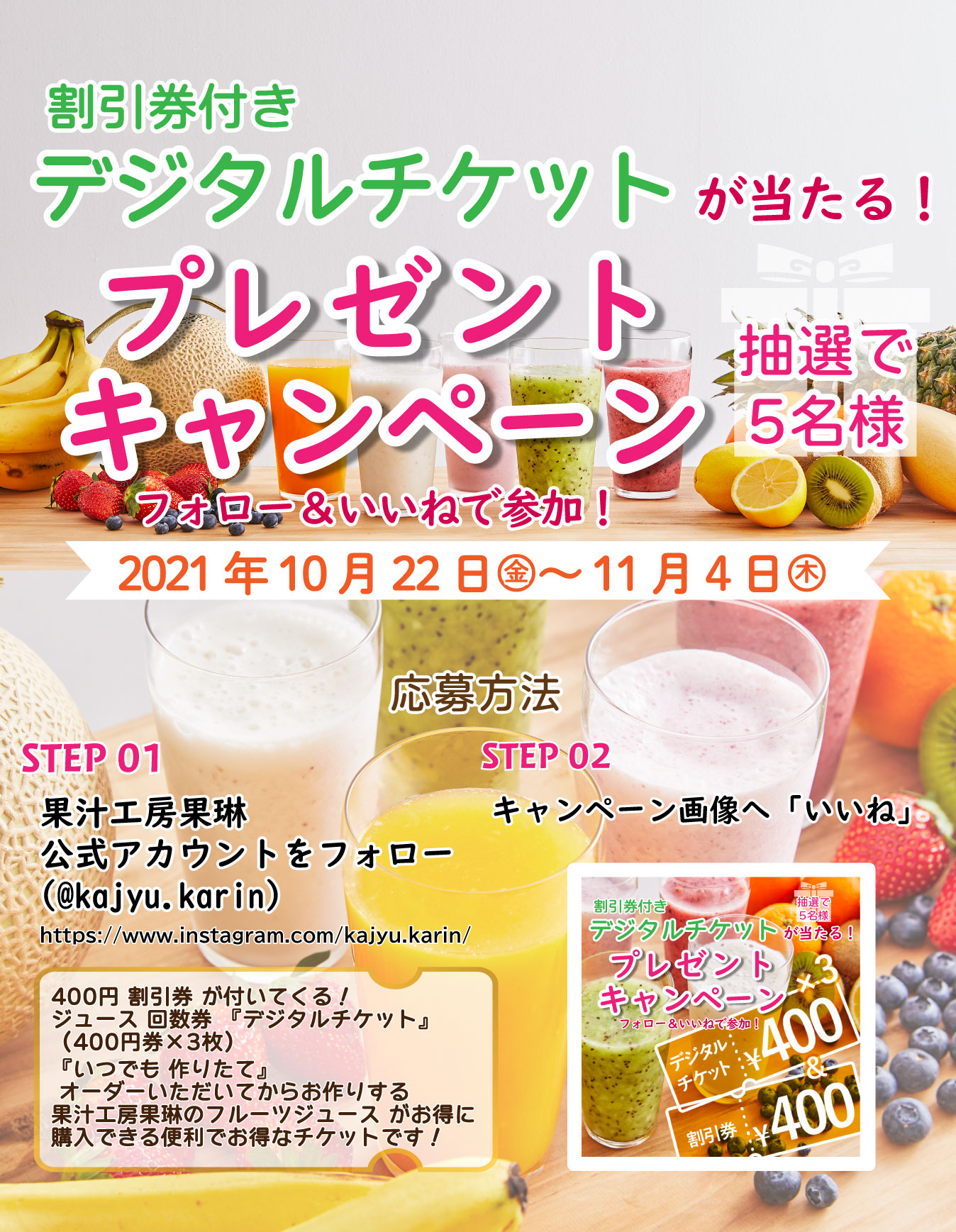 ① 果汁工房果琳インスタグラム 公式アカウント「@kajyu.karin」をフォロー