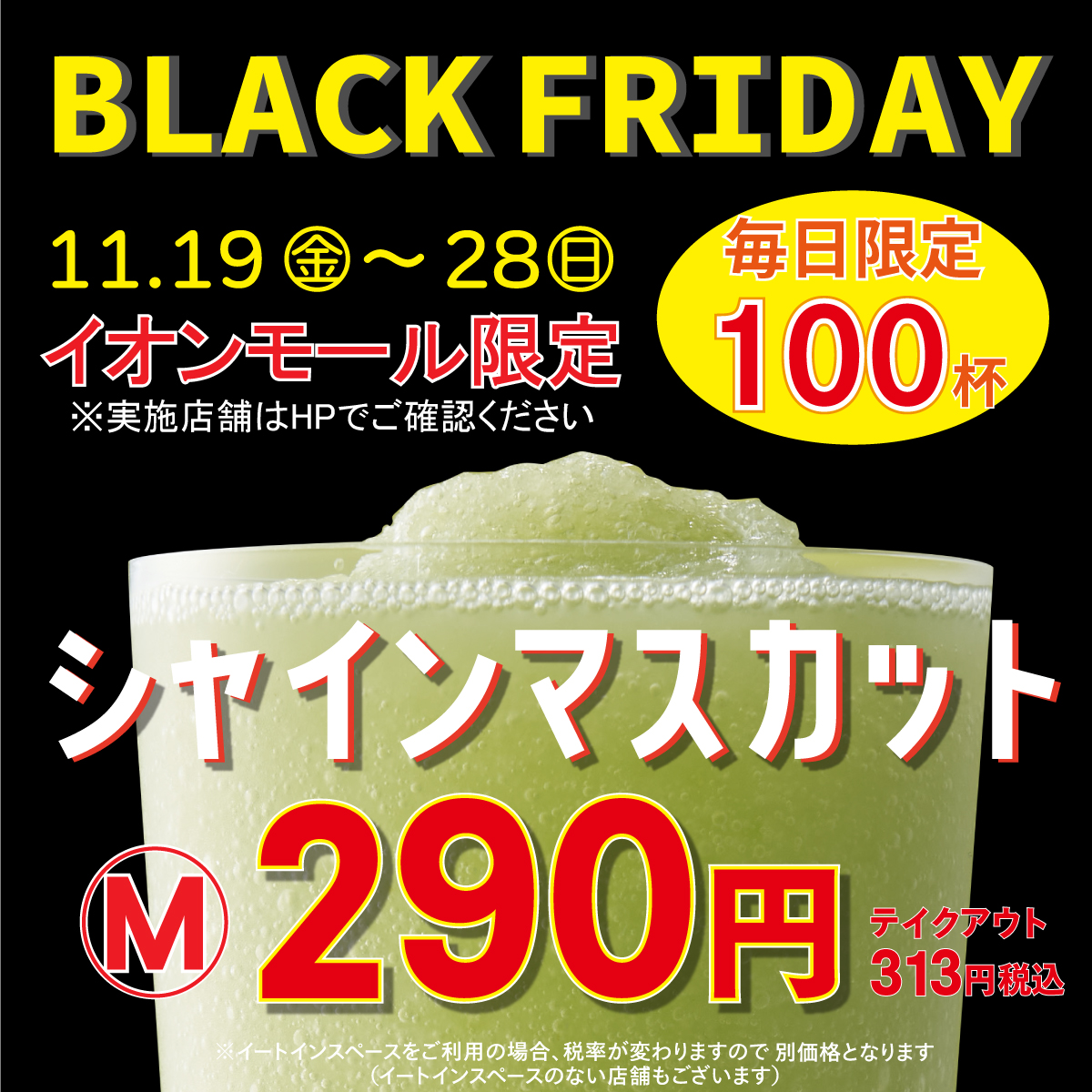 イオンモール店舗限定 毎日100杯限定で シャインマスカット Mサイズを 【特別価格】290円(テイクアウト313円・税込) で販売いたします‼