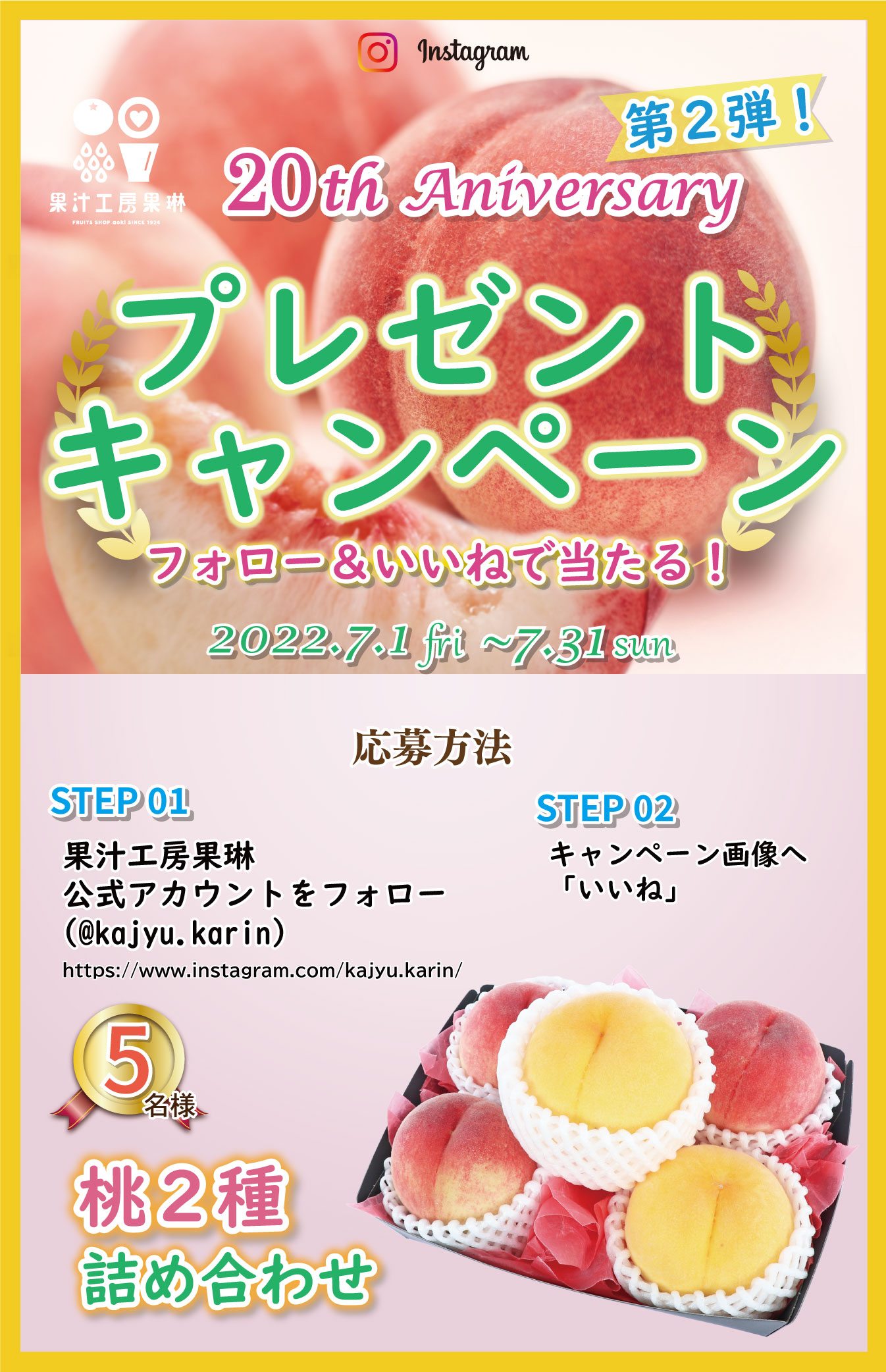 <オープン20周年特別企画 第2弾>桃2種詰め合わせが当たる!インスタグラムプレゼントキャンペーン
