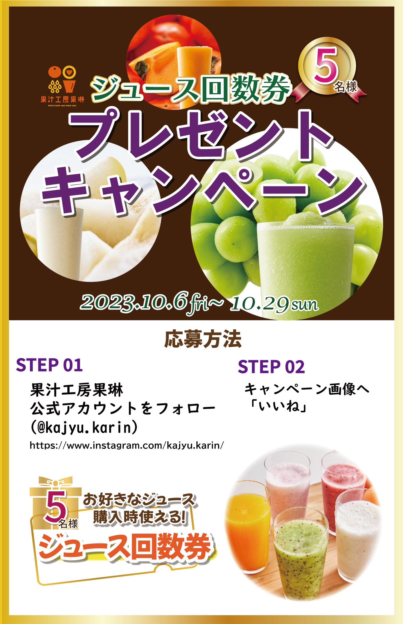 ① 果汁工房果琳インスタグラム 公式アカウント「@kajyu.karin」をフォロー